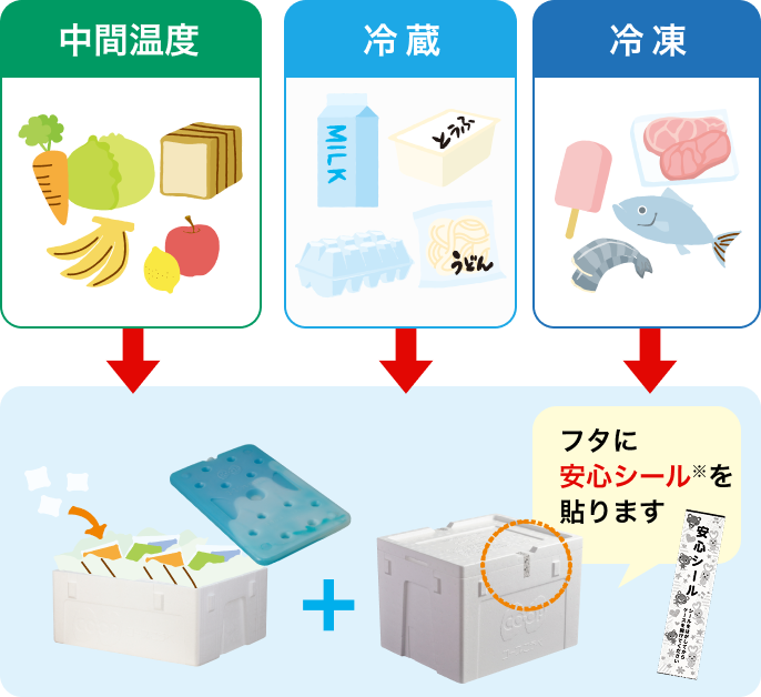 温度帯別に保冷剤を使用します。